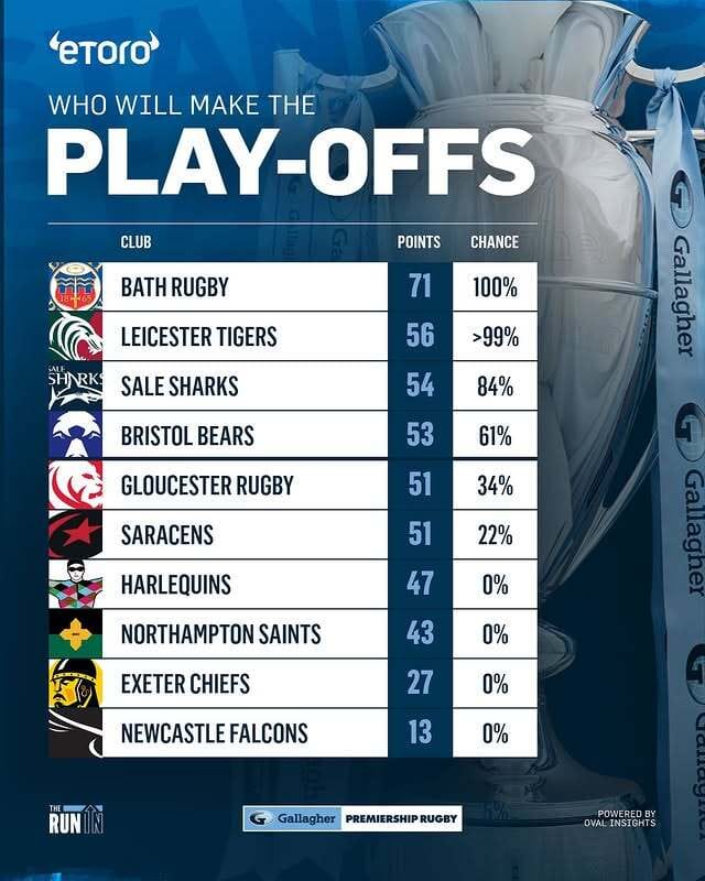 The Bears recently secured a notable 36-14 win over Bath Rugby, but their play-off hopes were dented after a defeat to Sale. The eToro prediction market has Bears on 61% probability to make the playoffs. The club has been active in the transfer market, signing new players and extending contracts, including a recent extension for Lane and Bevan, Jasmine & Alisha Joyce-Butchers. The Bears are aiming to strengthen their squad for the next Premiership season