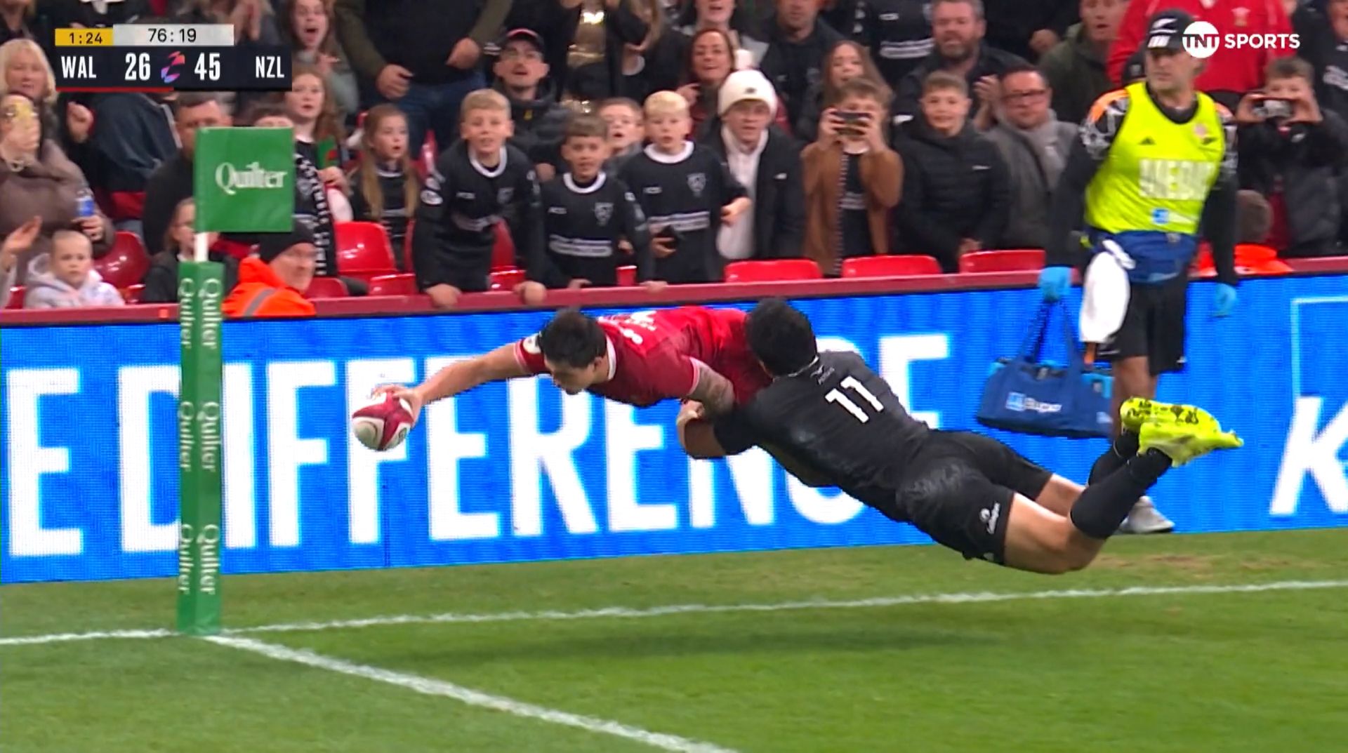 Is it a bird? Is it a plane? No! It’s a flying Bear. Louis Rees-Zammit scores a spectacular try for Wales, with a similarly airborne New Zealander for rather rough company.