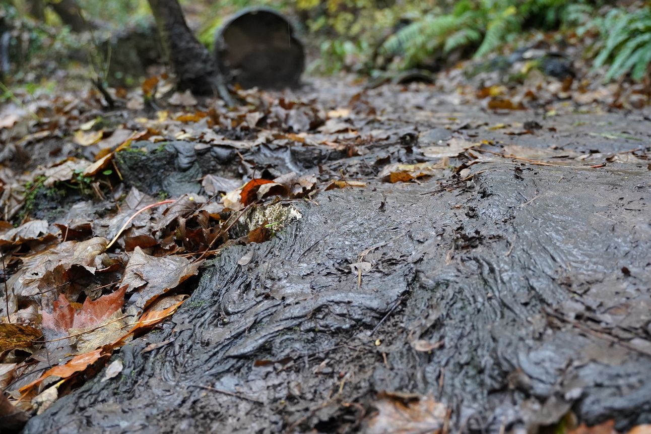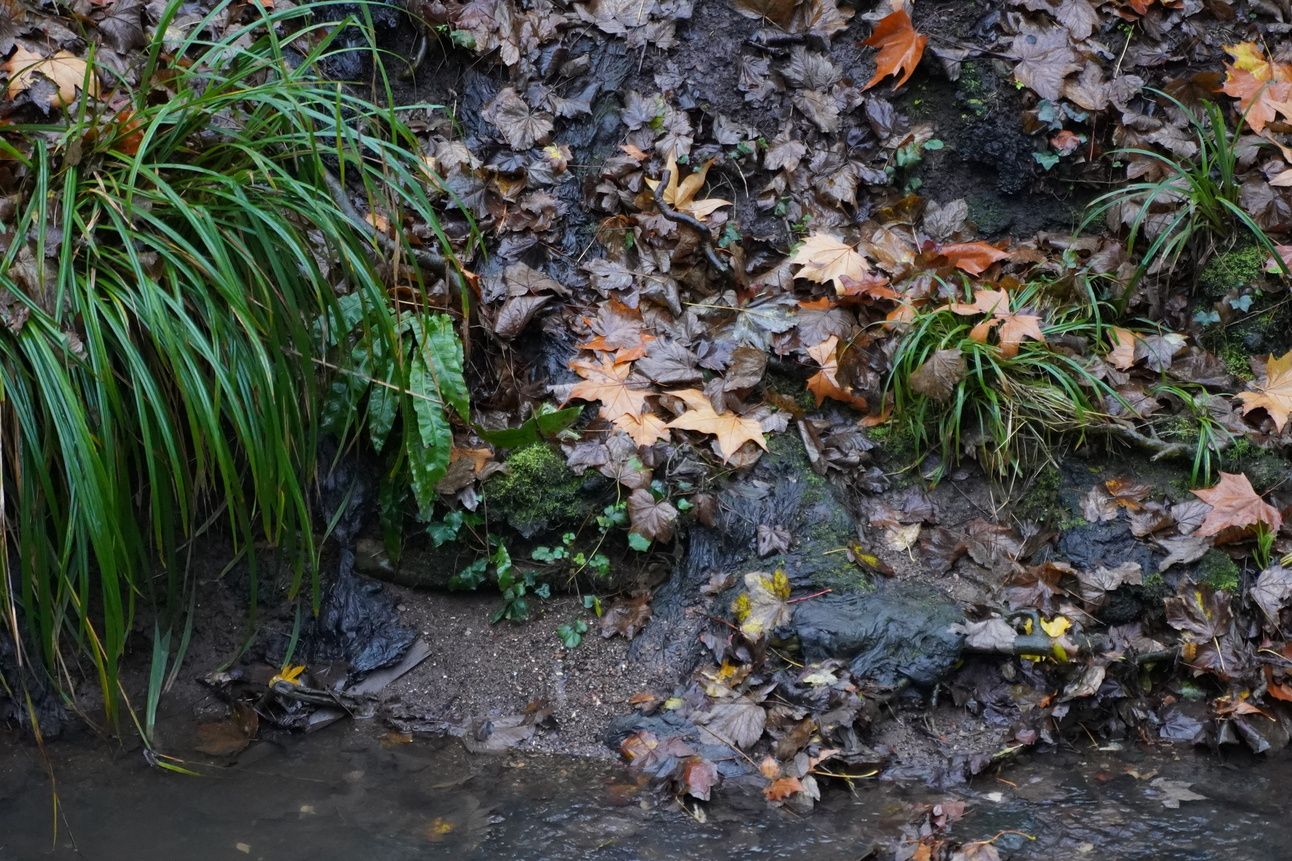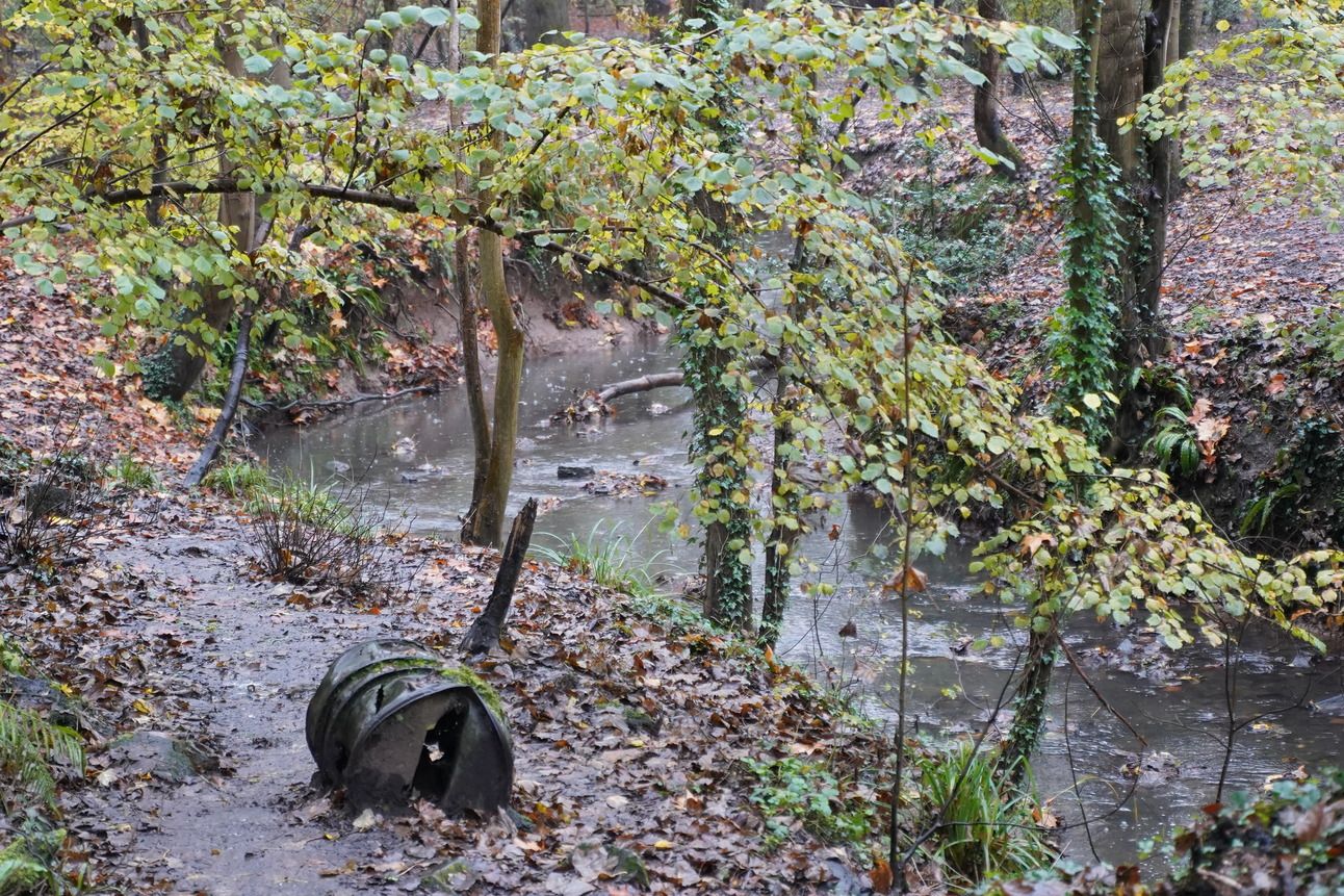 Rusty tar barrels and leaking tar next to Brislington Brook