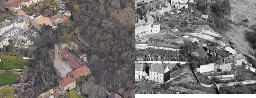Left: A Google Maps image of the coaching house on Wick Road. Right: A 1930 aerial photograph showing the same area with a construction site atop the steep sided valley. (Credit: Google/Friends of Brislington Brook)
